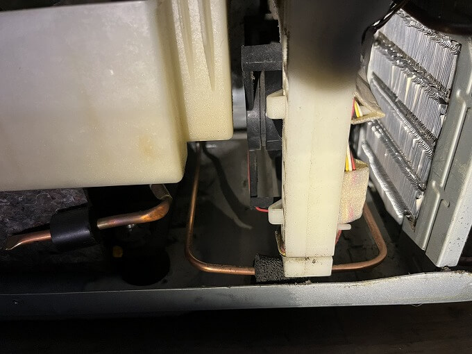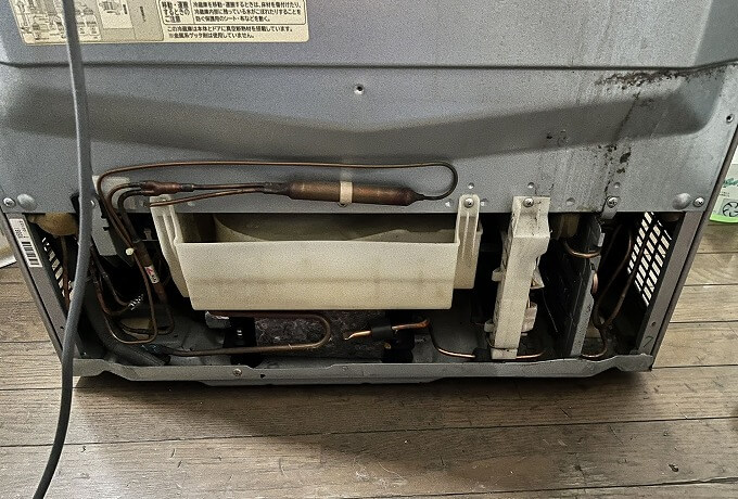 クーリングファンは冷蔵庫の後ろにあると思うので、本体を引っ張り出して、板金のカバーを外してみます。