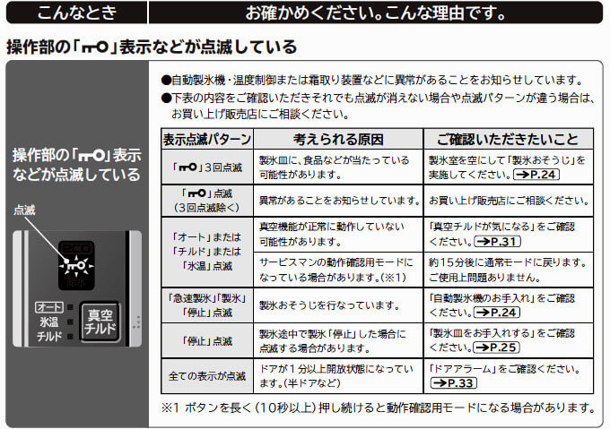 取説を見ると、3回点滅は製氷機の所を掃除すれば良いとのこと。それ以外はお買い上げ販売店にご相談くださいとのこと。