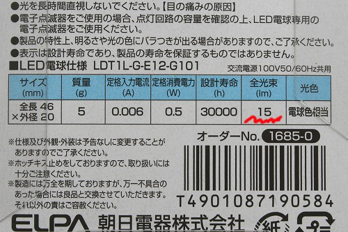 パナの小丸電球が10lmに対して、こちらは15lm。1.5倍です。期待できます。