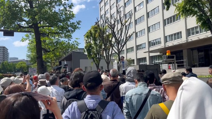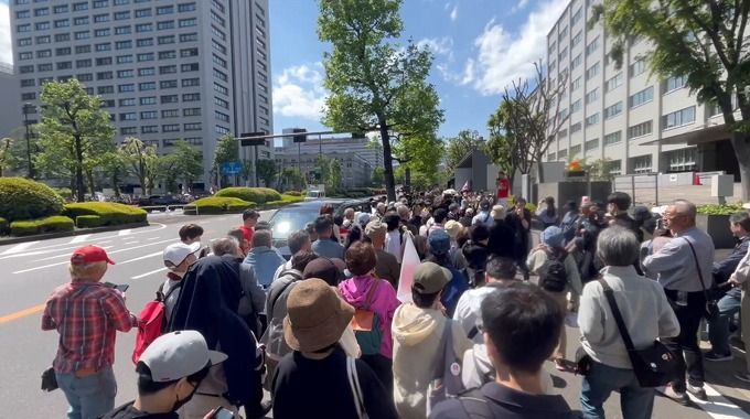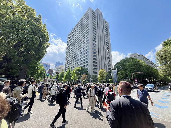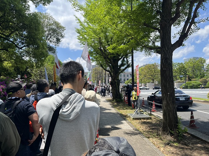 音の問題等で、厚労省前から林野庁前に街宣場所が変更になりました。片側3車線道路の反対側にも人が集まっています。