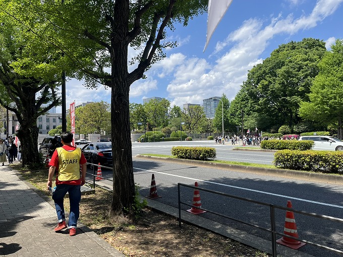 スタッフの指示通りに並んだけど、イメージしていたのは、この車道がいつの間にか人で溢れて制御が効かなくなる状態。でも、スタッフに迷惑かけても悪いしね。