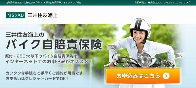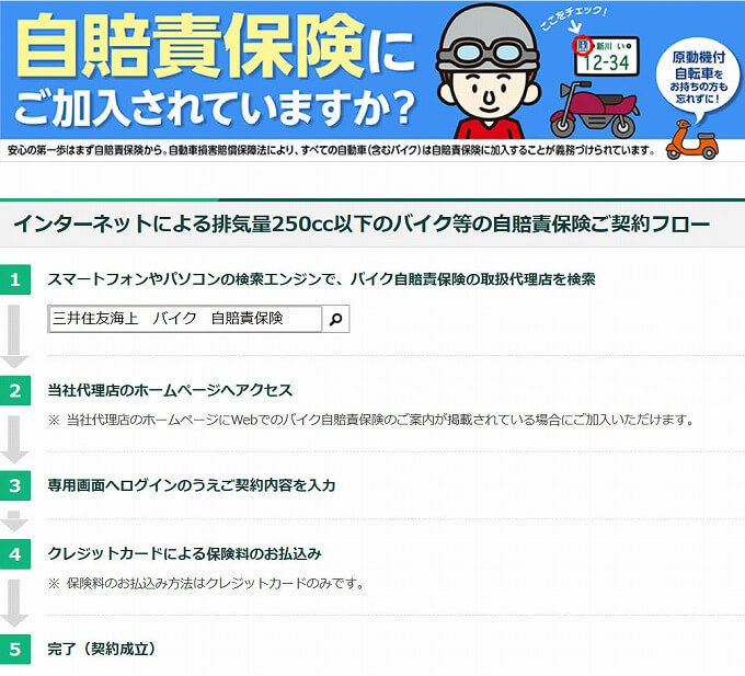 代理店に公平にチャンスを与えるためか、「三井住友海上 バイク 自賠責保険」で検索しろと書いてあります。これだとSEOの強い所が勝つよね。