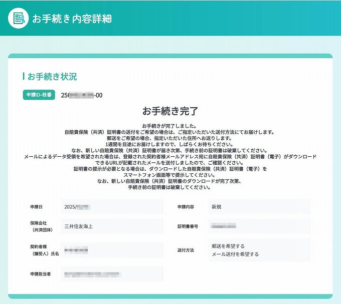 支払いを済ませたら契約手続き完了です。メールで送られてくるリンクから自賠責証明書のPDFがダウンロードできます。