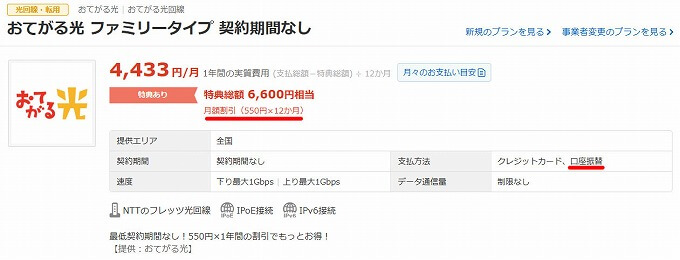 料金を銀行口座から自動振替で支払える所は、おてがる光以外では見つけられなかったので、その点は評価できます。料金はフレッツ光よりは安くなるが、割引率は平均レベル。
