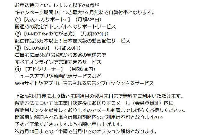 - 要らないオプション(2ヶ月無料)を押し付けられる。解除が手間。