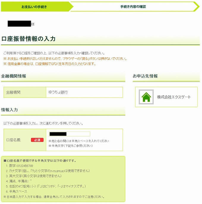 - それを私が入力し、口座振替の申し込み完了。