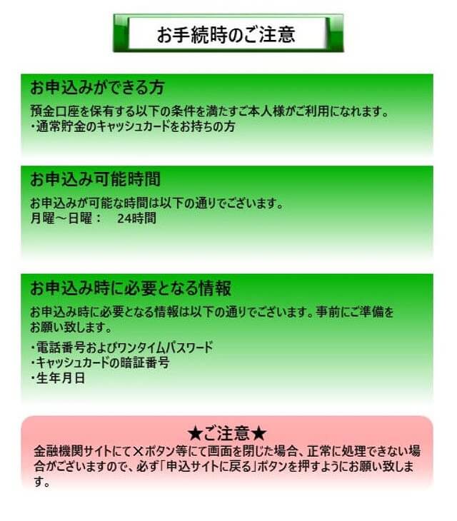 - 口座番号の他に、口座と紐づいた電話番号、ワンタイムパスワード、キャッシュカードの暗証番号、生年月日の情報が必要。