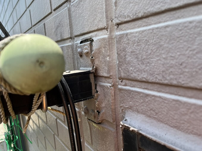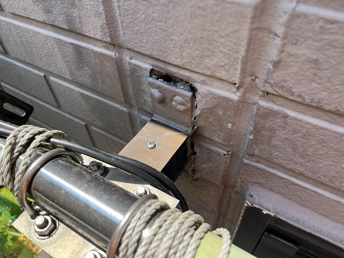 ソーラーパネルを載せているベランダの物干し竿受けが下方向に引っ張られて、上のボルトがサイディングから引き抜かれるように隙間ができています。
