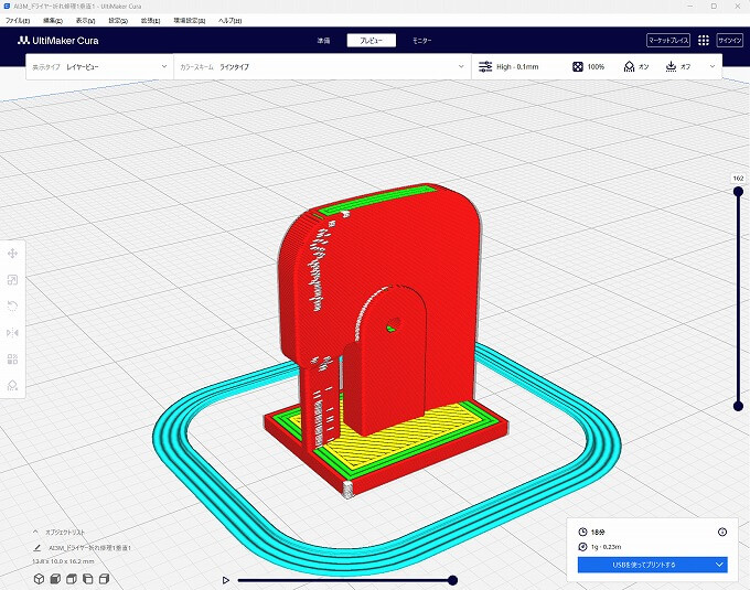 この向きで出力します。積層ピッチは高精度の0.1mm。