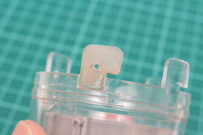 基本的な修理の流れは、ノズル側と作った爪がピッタリ嵌るようにヤスリで形を整えた後、接着剤を注入して溶着します。