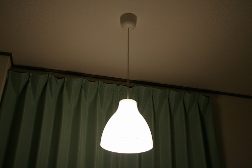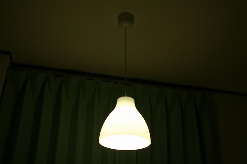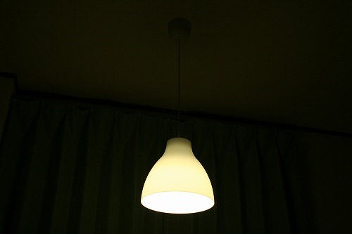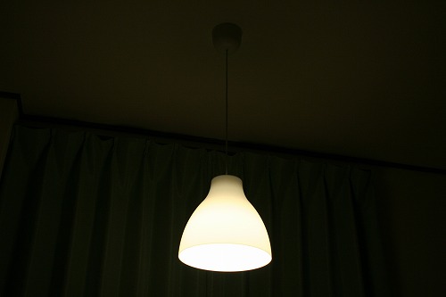我が家の食卓を照らしているのはIKEAのMelodiという透過型のペンダントランプです。これに60W級の電球を付け替えて、光り具合を比較してみました。