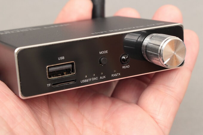 前面のUSB/ TFスロットから音楽等を有線/無線で再生できます。ボリュームはスイッチ付。