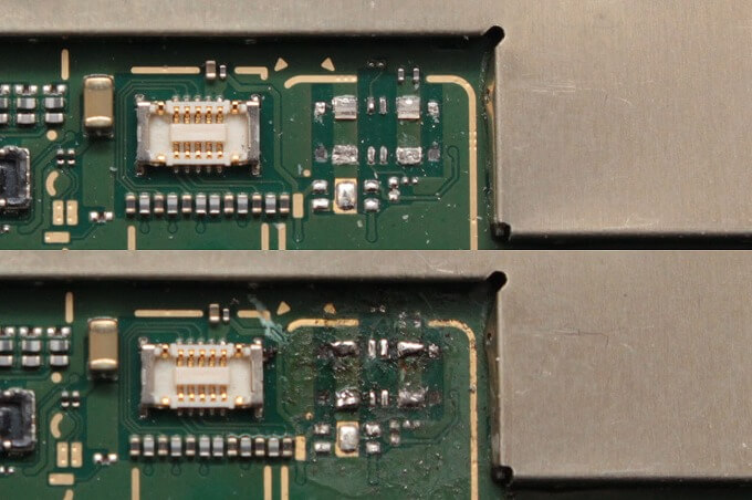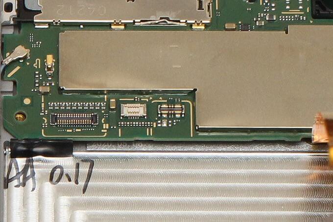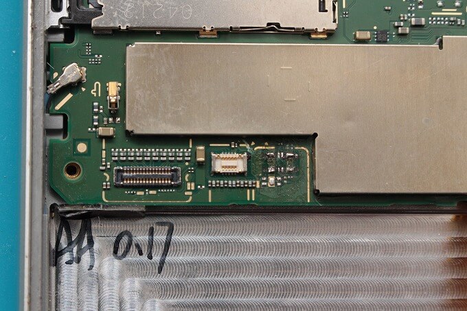 コネクタが取れてしまっています。ここを精密ドライバーでなぞると、上2つのハンダ部分が盛り上がっていています。コネクタの千切れた金属がくっついている感じ。
