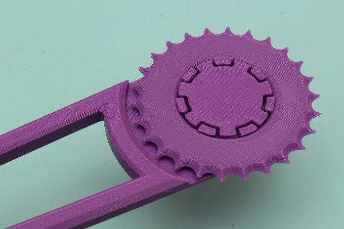 表面に見える縞模様は3Dプリンターで製造されたことを示しています。軸受部分の7つの爪は嵌め殺しのベンドになっていて、ここにギザギザローラーを嵌めればイイみたい。