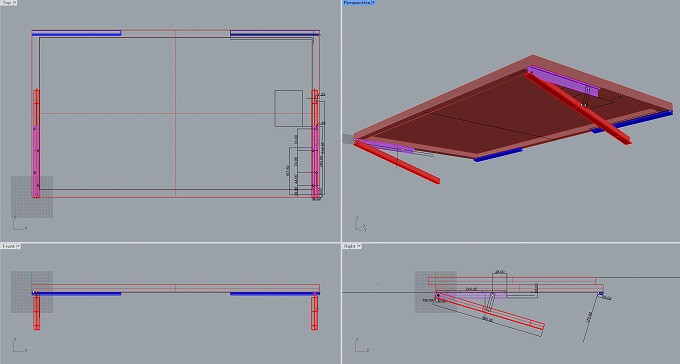 専用設計のアルミ製架台を陸屋根防水シートに貼り付け、市販の300mm長丁番を陸屋根の縁の金属板に貼って固定する目論見。