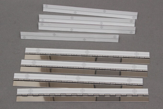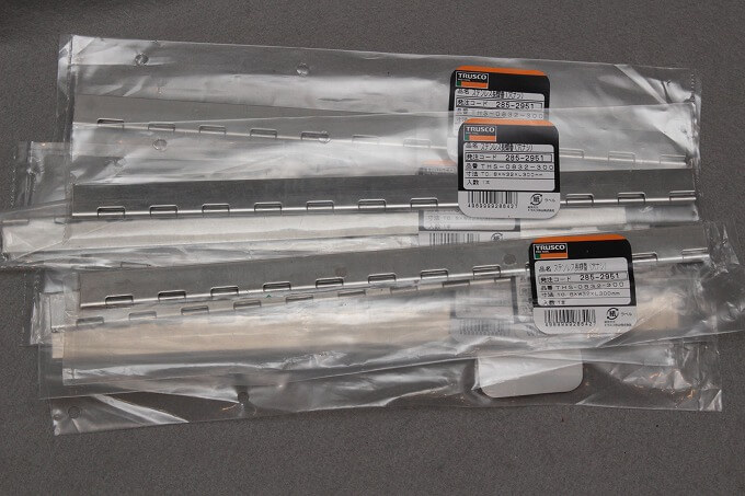 300mmの穴なし長丁番。水平面と斜め面をこれでがっちり貼り付けます。