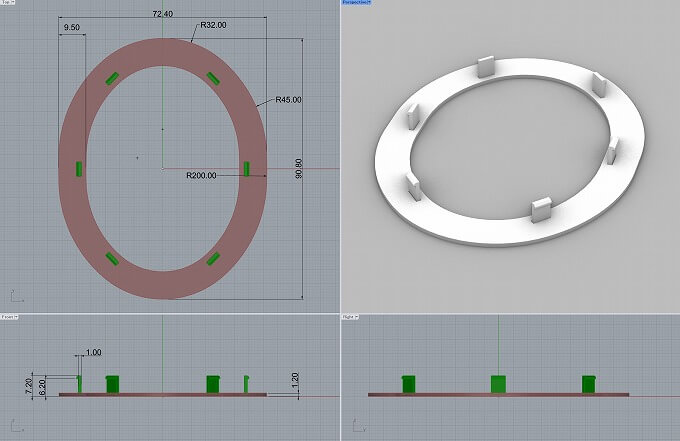 イヤーパッド現物を測り、コの字の切り欠きに爪が引っ掛かるようにモデリングします。