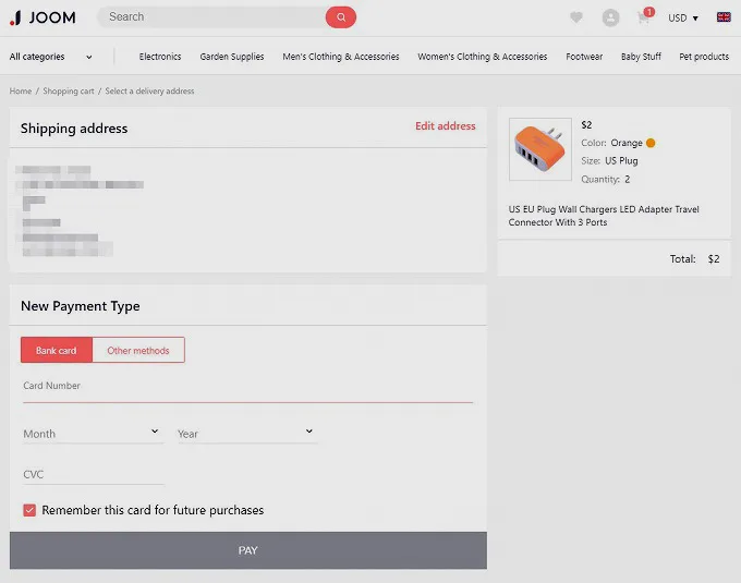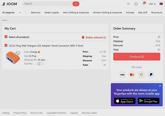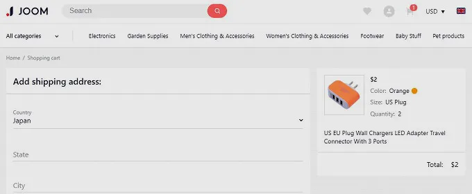 初回と次からは少し手順が違うかもしれません。今回は登録から続けて買い物をしました。購入するのはUSB ports wall charger (US Plug/Orange)。これを2個買ってみます。