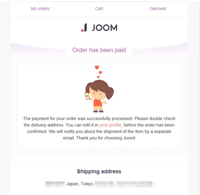 決済完了と同時にPayPalからは支払い明細、JOOMから支払い完了のEメールが来ています。