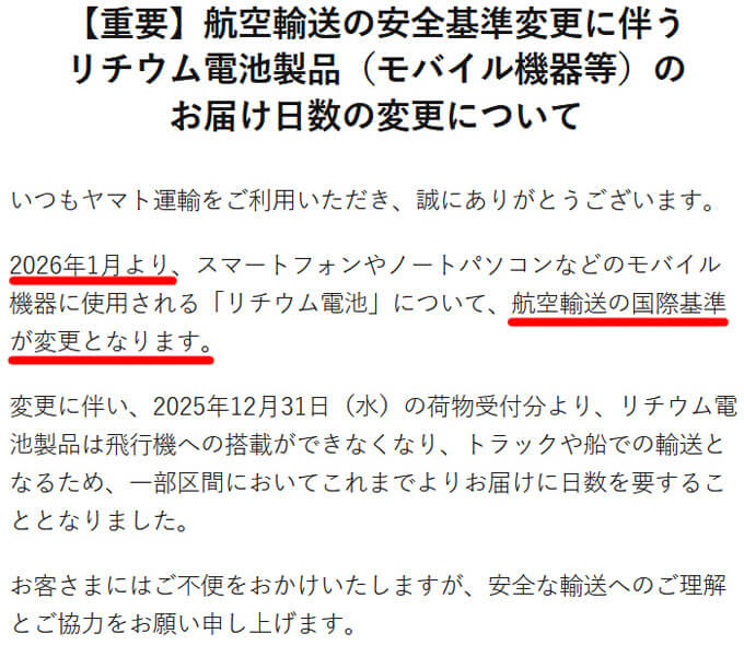 2026年1月から国際基準が変更され、リチウムバッテリーの空輸ができなくなるという情報を得たので、急いで18650を注文しました。