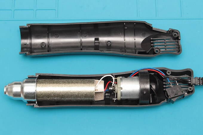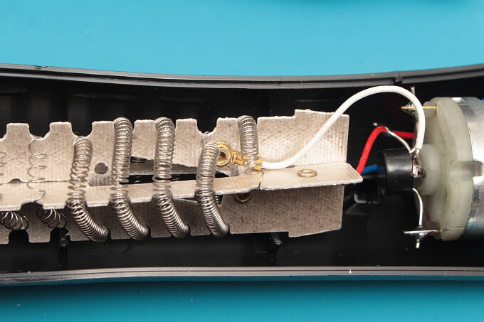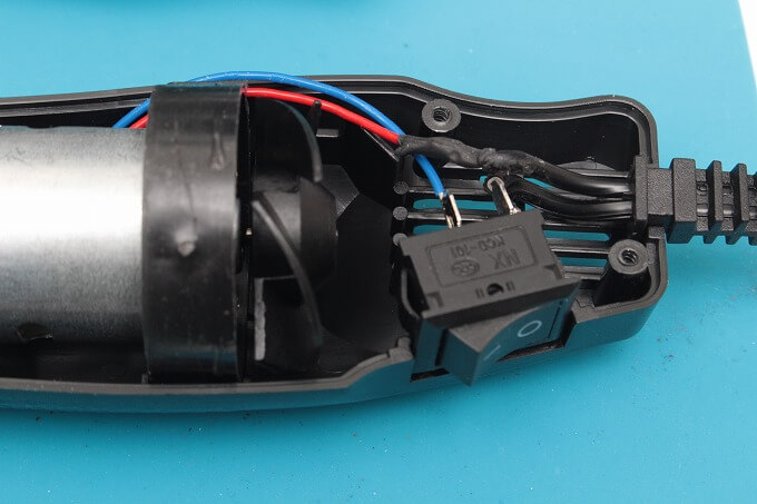 ロッカースイッチの手前にDC缶モーターがあり、ファンでヒーターに風を送る仕組み。