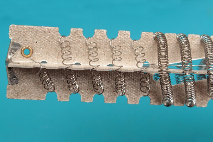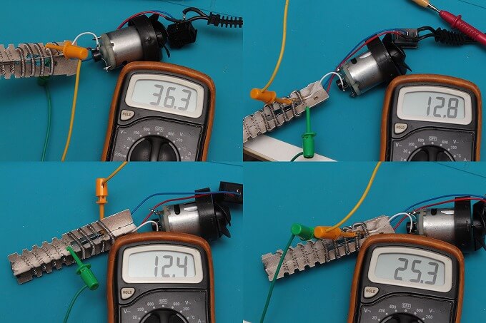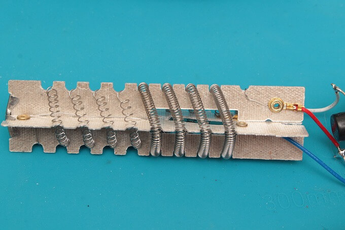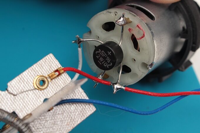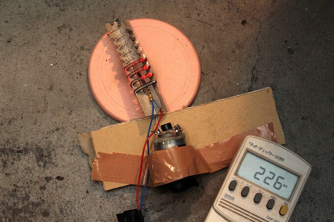 基板は無く、ニクロム電熱線、モーター、スイッチ、ブリッチダイオードの構成。
