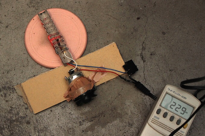 AC100Vが電熱線を通り、分圧(降圧)した後、ブリッジダイオードで整流されて、DCモーターを回す構造。