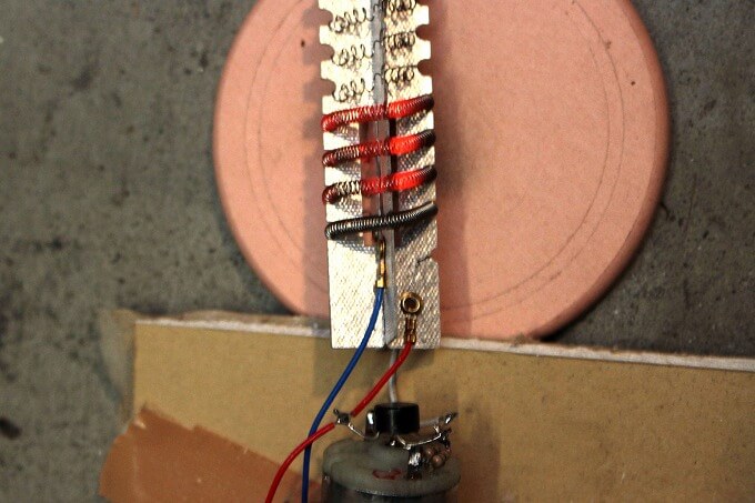 電熱線を短く切れば温度が上がるか?と思っていたけど、電熱線は赤熱すると抵抗値が下がるし、この製品は分圧してモーターを回しているので、設計・計算が難しい。