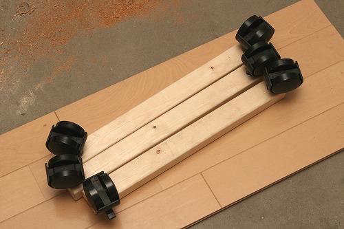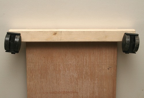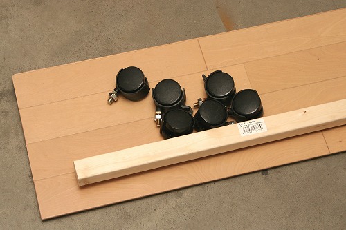 材料は床材の余り(900×300)とスチール棚か何かに付いていて使わなかったキャスター、それにホワイトウッド(30×40×1200)。