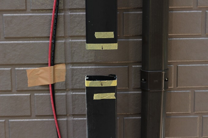 構想通りに縦樋を電気ノコギリで切断します。切り口が雑なので上下逆に付け直しました。