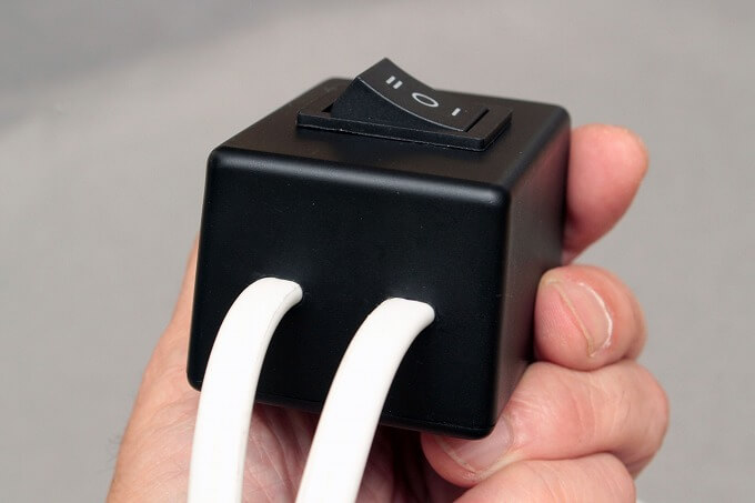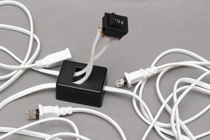 エアコンを使う時、壁上のコンセントか延長コードのコンセントに挿し替えることで、商用電源とソーラー電源を切り替えていました。これを簡単に切替できるスイッチを作りました。