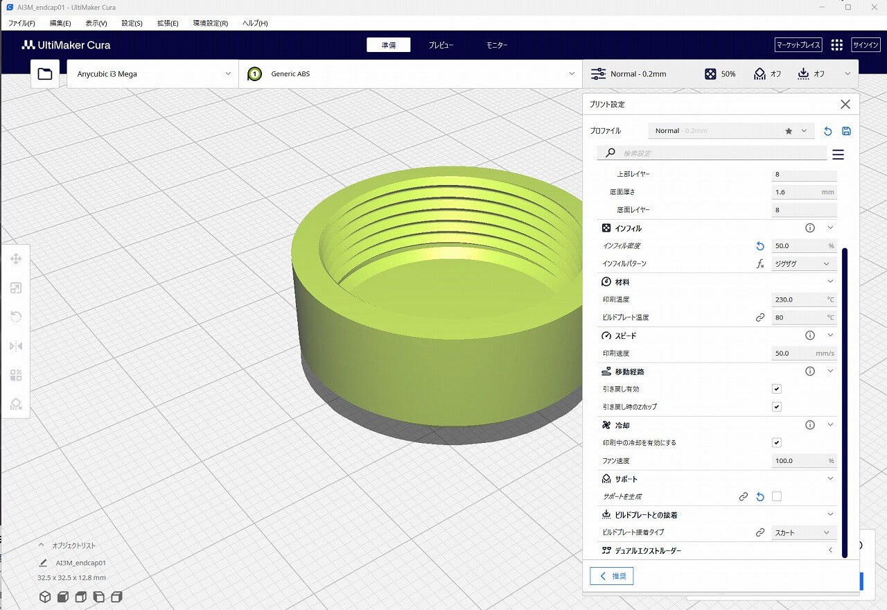 i3MegaにABSがセットされているので、まずはエンドキャップからプリントします。