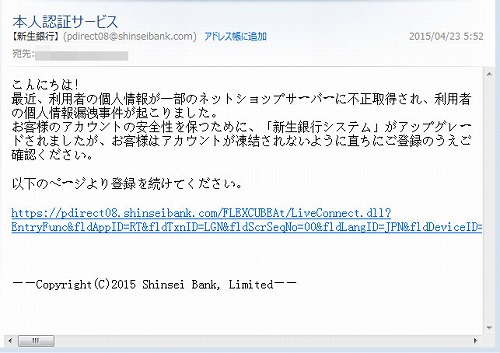 そして先週の【偽】新生銀行。文面は上の【偽】三菱東京UFJ銀行と同じです。