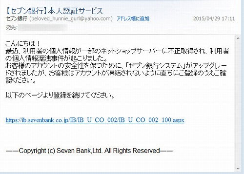 さて記事の下書きが書けた・・と思っていたら29日、今度は【偽】セブン銀行から来ました。