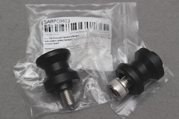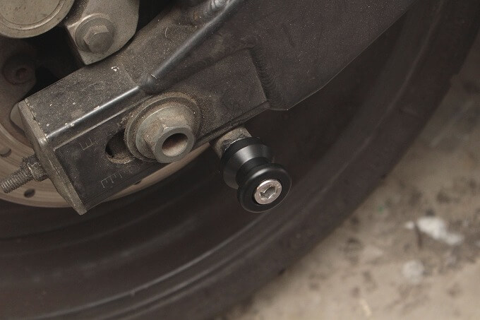 スイングアームに付いているM10のネジ穴にねじ込み、ここをスタンドのV字の板金の上に乗せる形となります。