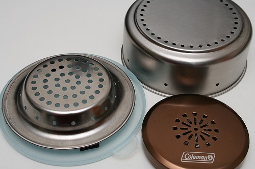 ステンレスのタッパーの中にベンジン(白金触媒式)カイロを入れて使います。